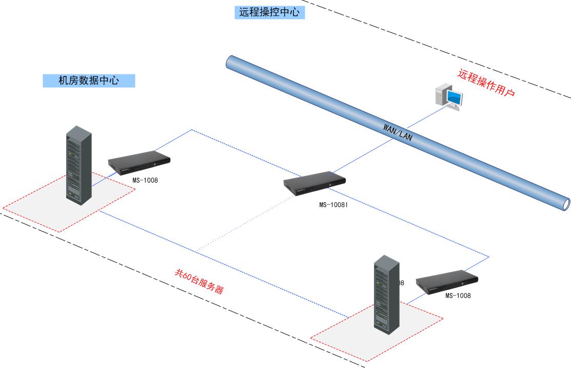 北京西單大悅城機房內共有8個機柜,60多臺服務器,8個機柜并在一起。以前一直采用網絡遠程方式(如3389 遠程桌面,或者Telnet進行管理)管理,現場需要臨時插顯示器使用,線纜繁雜,并且每臺機柜都配置鍵鼠和一臺顯示器,使用的時候臨時將其插到服務器,不能對服務器進行BIOS層次操作,并存在安全隱患,管理效率低。